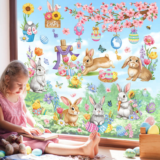 decalmile Easter Bunny Double Sided Window Clings Easter Rabbit Egg Spring Flower Tree Branch Anti-Collision Window Decals