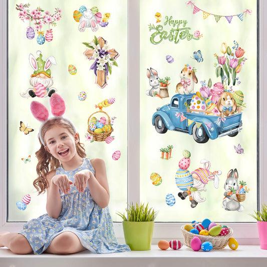 decalmile Easter Bunny Window Clings Easter Eggs Gnome Truck Flower Anti-Collision Window Decals