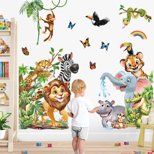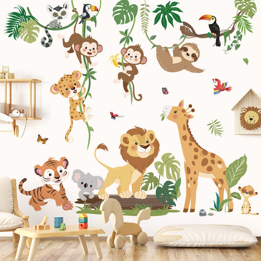 decalmile Safari Animals Wall Stickers Jungle Tree Branch Tropical Leaves Elephant Lion Wall Decals