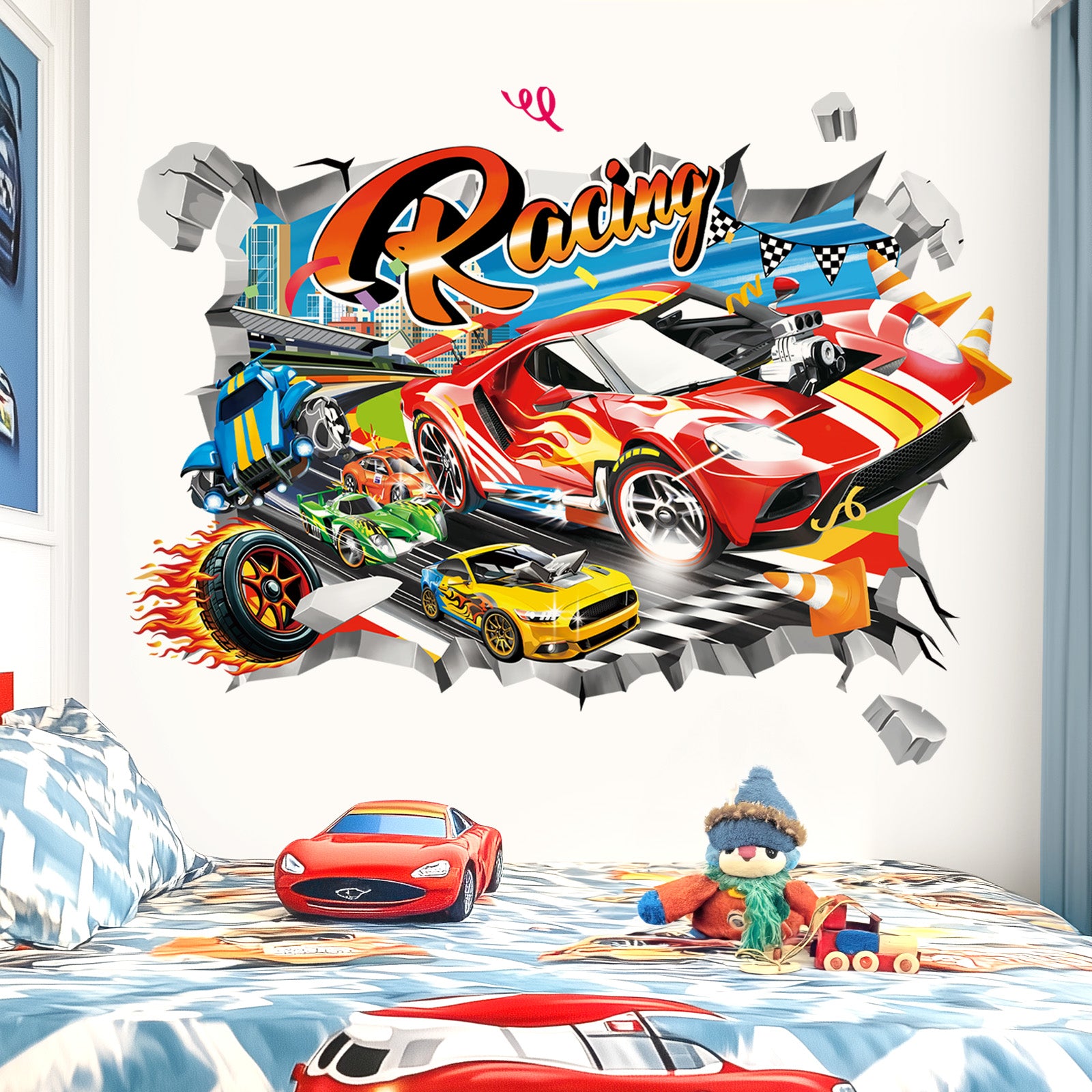 decalmile 3D Racing Cars Wall Stickers Break Through Red Cars Flags Wall Decals