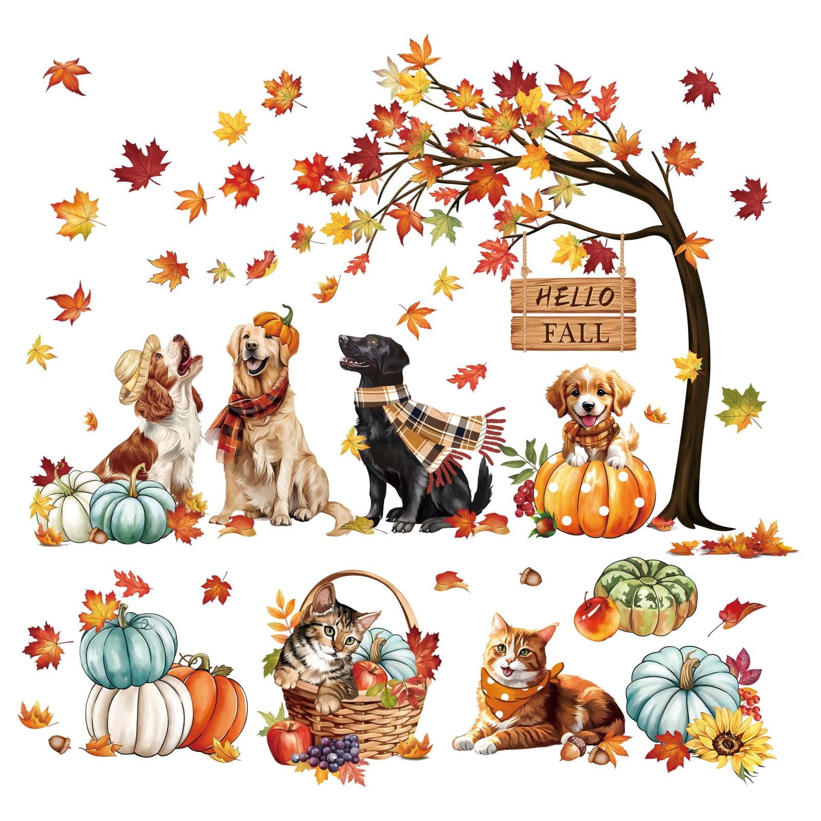 decalmile Hello Fall Thanksgiving Pumpkin Window Clings Dog Cat Autumn Maple Leaves Double Sided Anti-Collision Window Decals