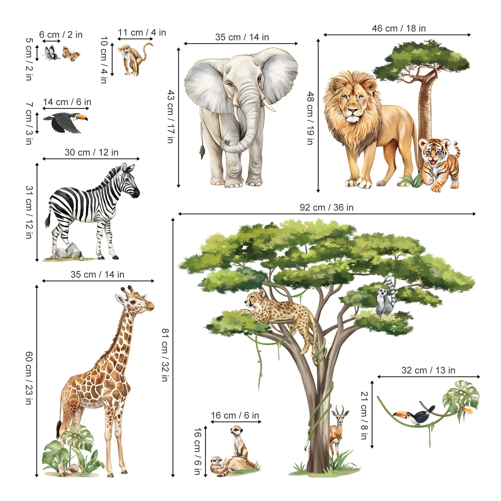 decalmile Large Safari Animals Tree Wall Stickers Jungle Animals Giraffe Elephant Lion Leopard Wall Decals(XXL)